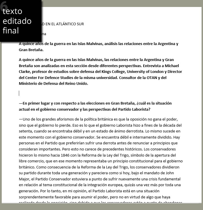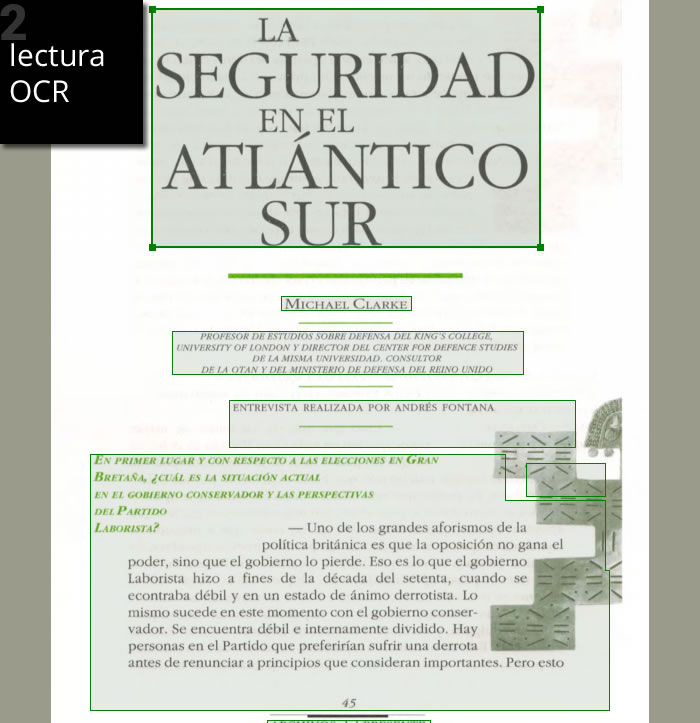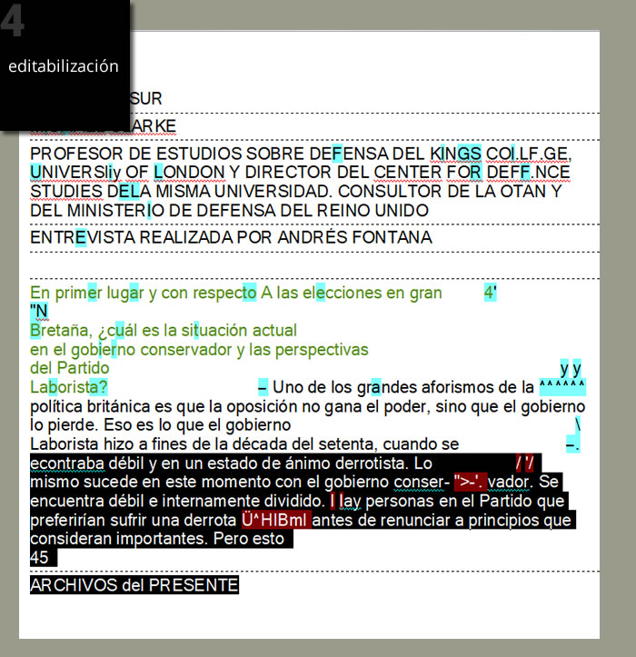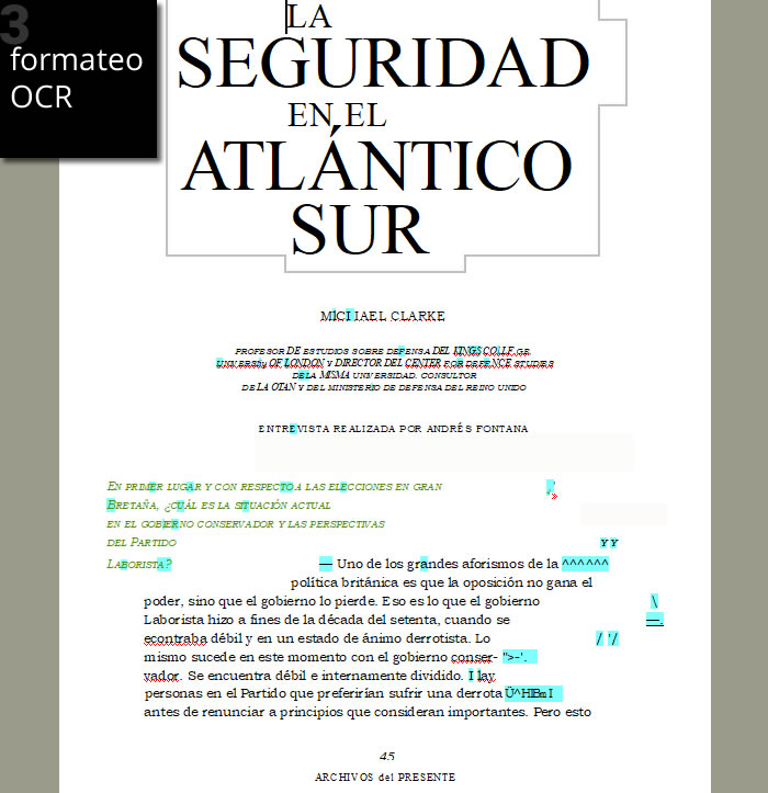 Mediante software OCR de última generación transformamos todas las imágenes en texto y se exportan a archivos de texto. Luego se procede a la limpieza de todos los caracteres errados provocados tanto por las ilustraciones, como por los errores de escaneo producto de la antigüedad del material. Esto se realiza con soft especial de automatización, búsqueda y reemplazo, a la vez, en cientos de archivos de texto. Luego se acomoda y formatea en forma manual la apariencia de los párrafos. A su vez, se corrige en forma automatizada la ortografía y la sintaxis del texto. Y por último, se realiza una revisión manual de todo el material.